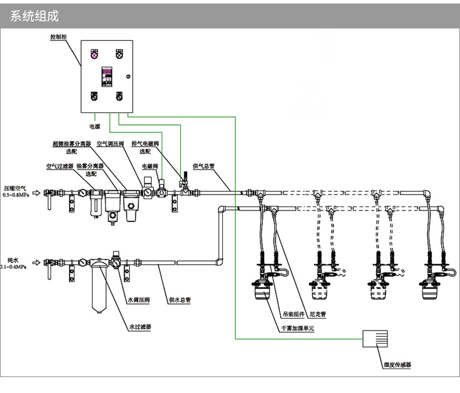 利用空壓機氣體將水霧化,水霧顆粒細、揮發(fā)快、效率高。